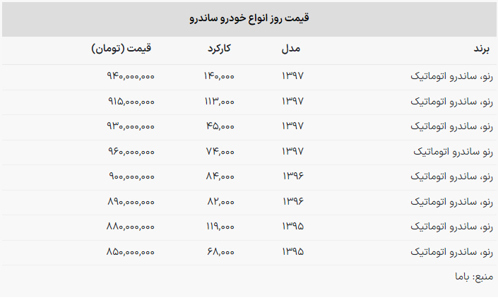 با مطالعه جدول زیر اطلاعات کاملی درباره قیمت روز خودروهای ساندرو به دست خواهید آورد: