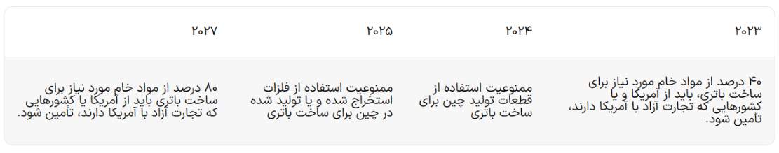 آمریکا می خواهد چین را از زنجیره تولید محصولات خودروسازانی مثل تسلا (Tesla)، فورد، جنرال موتورز و استلانتیس به طور کامل حذف کند؛ موضوعی که به دلیل محدودیت های موجود در شبکه تأمین قطعات می تواند شرایط سختی را برای شرکت های آمریکایی پدید بیاورد. برای مثال کمبود مواد خام کمیاب که بر سر تصاحب آنها رقابت شدیدی وجود دارد، خودروسازان آمریکایی را در تنگنا قرار خواهد داد. سیاستی که آمریکا در این رابطه دنبال می کند، به شرح زیر است:
