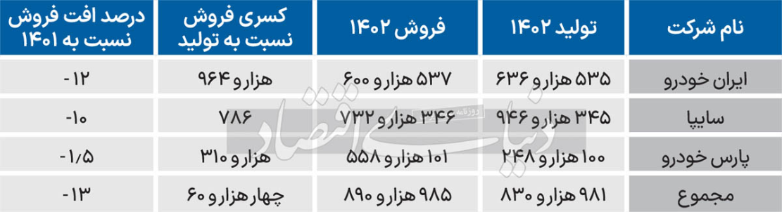 دنیای اقتصاد/ خودروسازان بزرگ کشور با ارائه گزارش عملکرد سال گذشته خود به بورس، میزان تولید و فروش در سال ۱۴۰۲ را اعلام کردند. طبق گزارشی که در سامانه کدال بورس منتشر شده، هر سه خودروساز بزرگ کشور در سال گذشته فروش کمتری نسبت به سال ۱۴۰۱ داشتهاند. نکته مهم دیگر اینکه نسبت فروش محصولات خودروسازان به تولید آنها در سال ۱۴۰۲منفی بوده است. به عبارت بهتر، خودروسازان کمتر از آنچه تولید کردهاند، فروختهاند. این بدان معناست که بخشی از تولید خودروسازان عرضه نشده و به انبار رفته تا بعدا و احتمالا پس از اصلاح قیمت کارخانهای خودروهای داخلی، عرضه شوند.