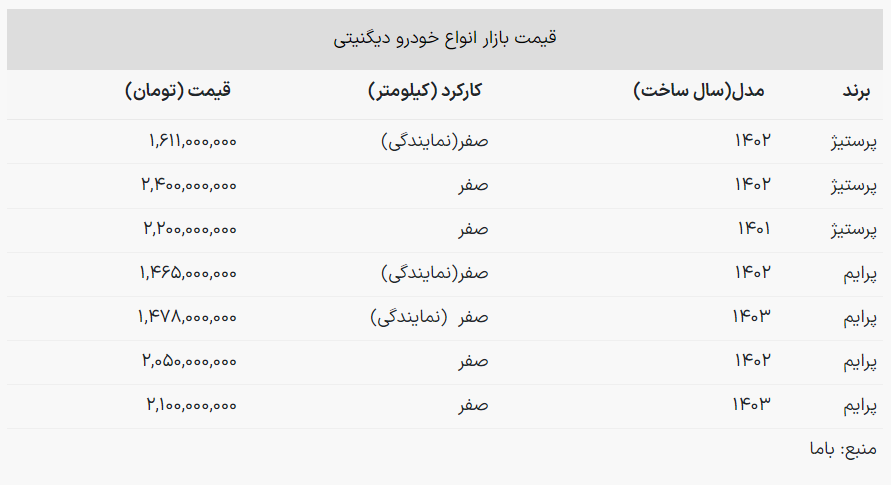 قیمت دیگنیتی صفر مدل پرستیژ ۱۴۰۲ با رشد ۷۰ میلیونی به ۲ میلیارد و ۴۰۰ میلیون تومان رسید.