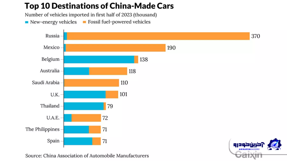 مخاطبان خودرویی در بازارها توسعه یافته و پیشرفته عموما نام خودروهای چینی را با قابلیت های تمام برقی و خودران شنیده اند اما نباید فراموش کرد که همچنان سهم قابل توجهی از صادرات خودرو از چین مربوط به خودروهای بنزینی است. بازار هدف خودروهای معمولی و بنزینی چینی عموما بازار های در حال توسعه است و عرضه خودروهای چینی در این کشور ها ارقام قابل توجهی را نشان می دهد.آمار زیر مربوط به مقاصدی است که بیشترین واردات خودرو را از چین داشته اند. در این لیست نام کشورهایی نظیر روسیه، مکزیک، بلژیک، استرالیا، عربستان سعودی، بریتانیا، تایلند، امارات متحده عربی، فیلیپین و اسپانیا را می بینیم. البته در اغلب کشورهای اروپایی سهم برقی ها (رنگ آبی) بیشتر است و این نکته نشان می ده سبد چینی ها برای هر بازاری می تواند کامل باشد.