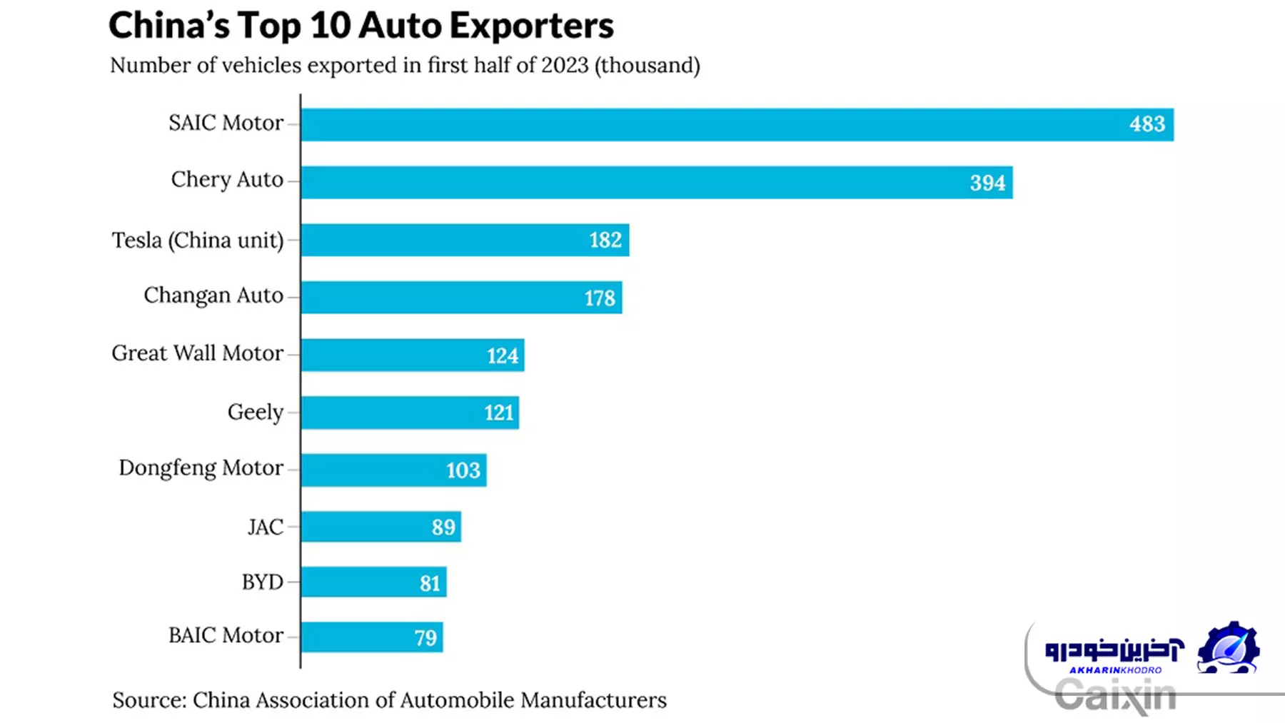 آمار های مربوط به نیمه اول سال ۲۰۲۳ بیانگر آن است که کمپانی های سایک، چری، چانگان، گریت وال، جیلی، دانگ فنگ، جک، بی وای دی و بایک بیشترین میزان صادرات خودرو را در این بازه داشته اند. البته میزان صادرات برای دو کمپانی چری و سایک به میزان قابل توجهی بیشتر از باقی خودروسازان است. چری را در ایران با خودروهای ام وی ام، فونیکس و اکستریم می شناسیم. این خودروساز یک کمپانی صادرات محور بوده و از ابتدا تا بحال از بزرگ ترین صادر کنندگان خودروی چین به حساب می آید.