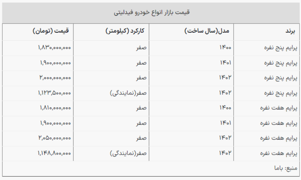 همچنین قیمت فیدلیتی پرایم هفت نفره در کارخانه ۱ میلیارد و ۱۴۸میلیون تومان بوده است. قیمت کارخانه فیدلیتی ۵ نفره نیز ۱ میلیارد و ۱۲۳ میلیون تومان بوده است.