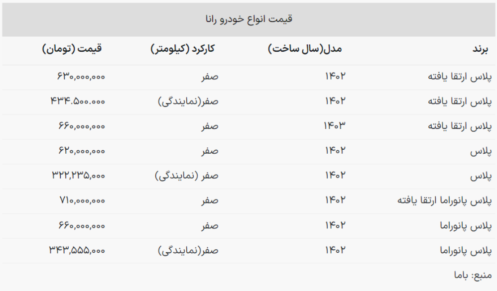 با مطالعه جدول زیر اطلاعات بیشتری درباره قیمت روز خودروهای رانا به دست خواهید آورد: