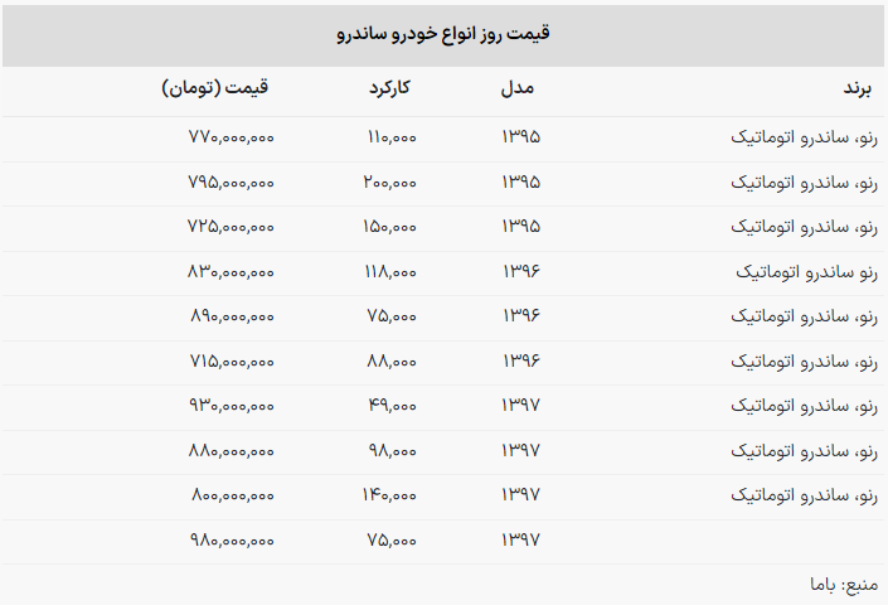 با مطالعه جدول زیر اطلاعات کاملی درباره قیمت روز خودروهای ساندرو به دست خواهید آورد: