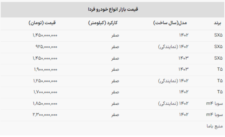قیمت فردا SX۵ مدل ۱۴۰۳ نیز ۱ میلیارد و ۴۵۰ میلیون تومان شد.