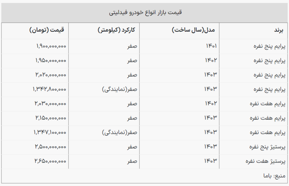 همچنین قیمت فیدلیتی پنج نفره مدل 1403 در بازار خودرو 2 میلیارد و 20 میلیون تومان است.
