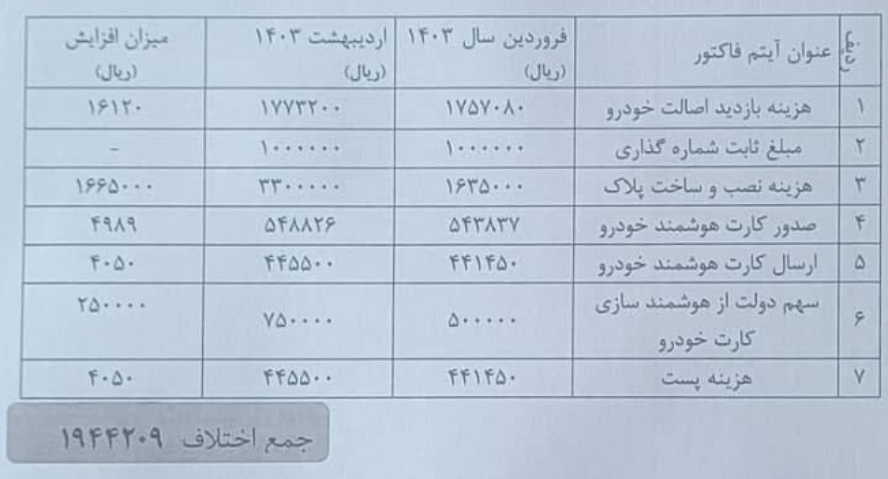 لذا مطابق ابلاغیه مراجع ذیربط نرخ جدید هزینه بازدید اصالت خودرو، مبلغ قابت شماره گذاری، هزینه نصب و ساخت پلاک، صدور کارت هوشمند، سهم دولت از هوشمندسازی کارت خودرو ، هزینه پست اعلام شده و هزینه قابل پرداخت توسط خریداران به شرح ذیل در فاکتور فروش لحاظ خواهد شد.