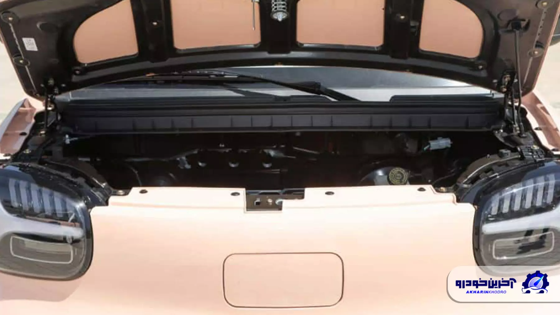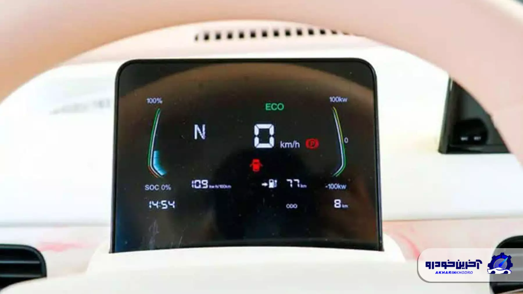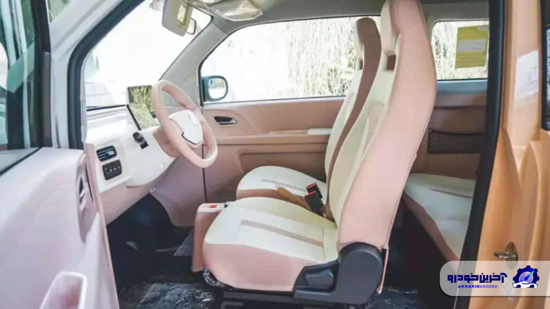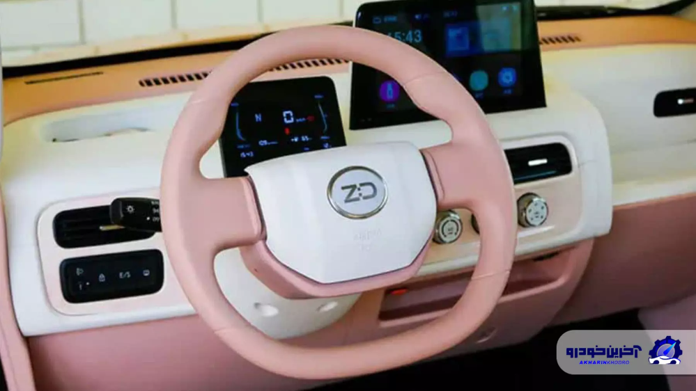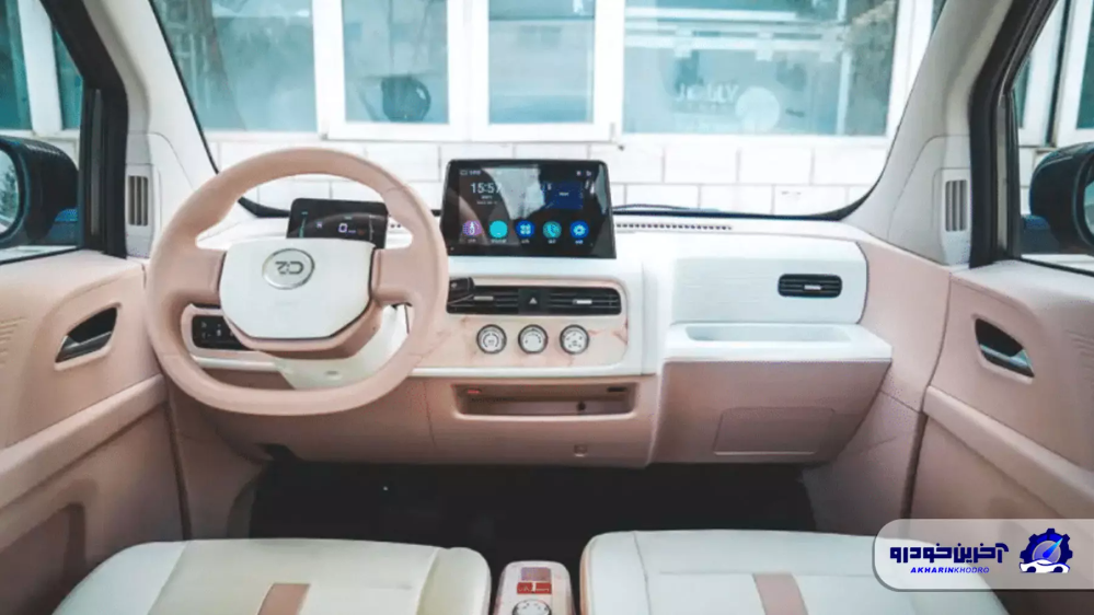 کابین خودرو با پس زمینه صورتی با فرمان دو شاخه، پشت صفحه کیلومتر ال سی دی ۵ اینچی و صفحه نمایش کنترل مرکزی ۹ اینچی زیبا است. دکمه های فیزیکی از نوع چرخشی در زیر صفحه کنترل مرکزی قرار گرفته اند.