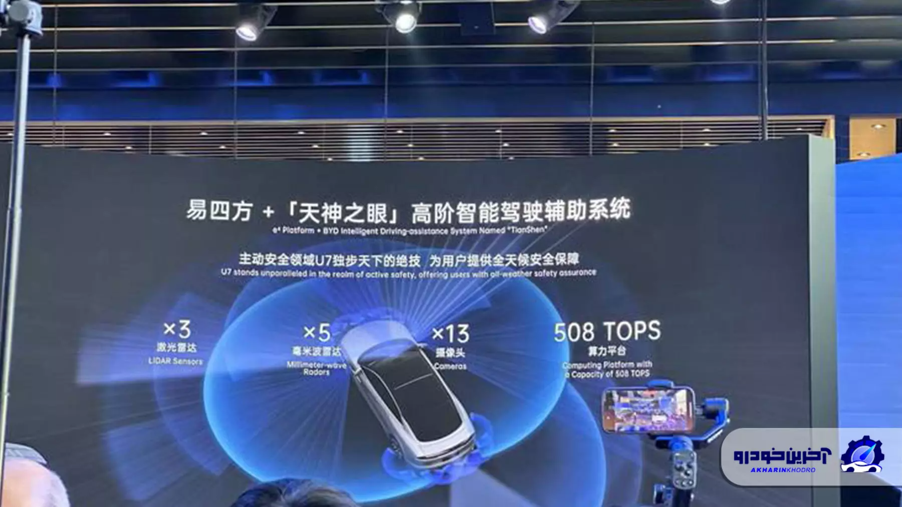 سقف سدان برقی و فوق العاده قدرتمند بی وای دی یانگ وانگ U7 پانورامیک است. همانند آینه های جانبی، آینه داخلی این خودرو نیز در مدل پرچمدار با دوربین دید عقب جایگزین می شود. این سدان برقی به سیستم رانندگی هوشمند «تیان شن» مجهز است و در برخی شرایط معین می تواند به صورت خودکار مسیر را طی کند. سه ماژول لایدار، ۵ رادار موج میلیمتری و ۱۳ دوربین داده های خود را در اختیار سیستم خودران و سایر سامانه های U7 قرار می دهند. چنین سخت افزار قدرتمندی، قدرت محاسباتی ۵۰۸ تاپس را برای سدان مدرن گروه بی وای دی به ارمغان آورده است.