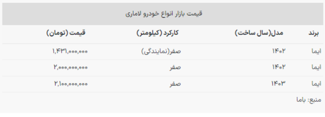 قیمت مدل ۱۴۰۲ لاماری ایما نیز در بازار ۲ میلیارد تومان شد که ۲۰ میلیون تومان ارزان شده است.