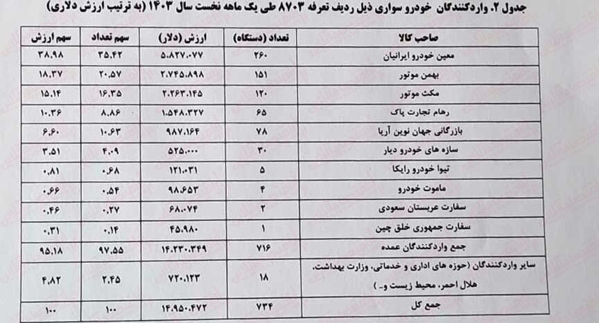 طی این مدت بیشترین واردات خودرو سواری توسط شرکت معین خودرو ایرانیان با واردات ۲۶۰ دستگاه خودرو به ارزش ۵.۸ میلیون دلار بوده که سهمی بالغ بر ۳۵ درصد از تعداد کل خودروها را شامل میشود.
