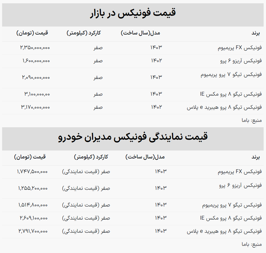 بر اساس جدیدترین قیمت محصولات مدیران خودرو در بازار، قیمت فونیکس FX پریمیوم به ۲ میلیارد و ۳۵۰ میلیون تومان رسیده است. همچنین قیمت آریزو ۶ پرو نیز یک میلیارد و ۶۰۰ میلیون تومان است.