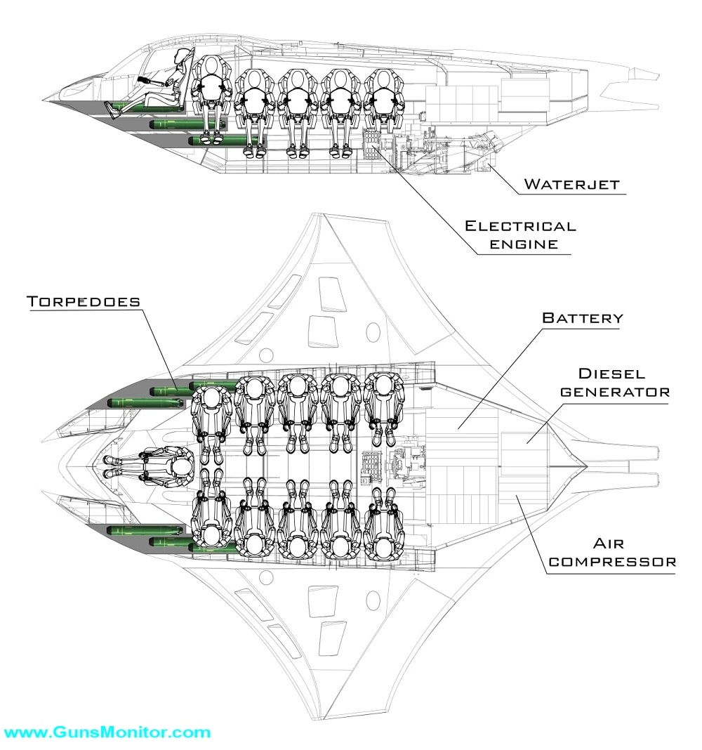 به گفته سازندگان، این زیردریایی دارای بدنه ای فولادی است که با مواد کامپوزیت پوشانده شده تا امکان تشخیص و شناسایی آن دشوارتر شود.