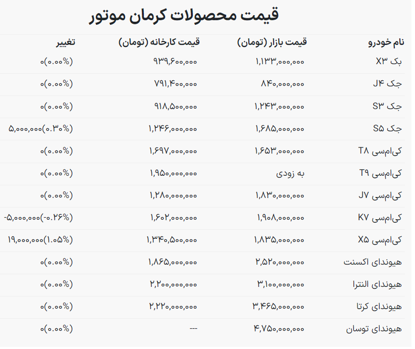 قیمت محصولات کرمان موتور در بازار و کارخانه
