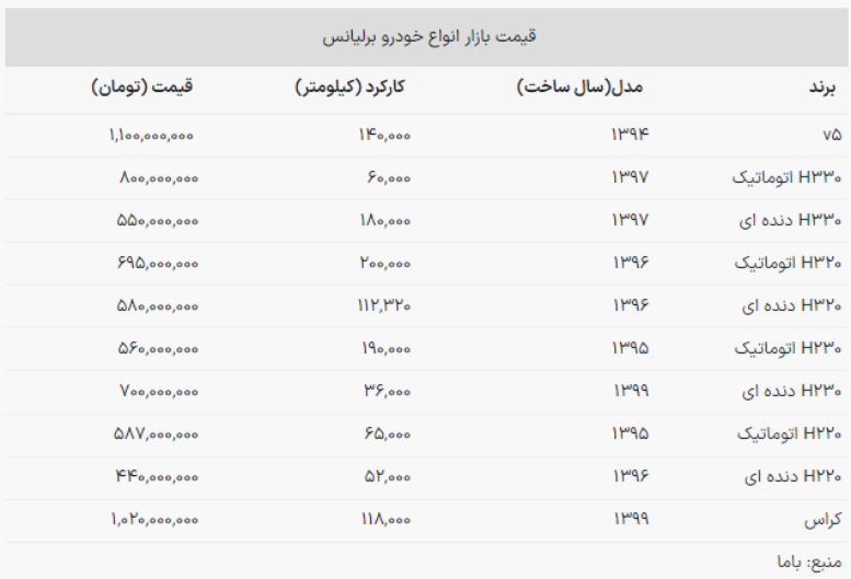 با مطالعه جدول زیر اطلاعات کاملی درباره قیمت روز انواع خودروی برلیانس به دست خواهید آورد: