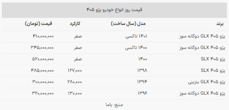 با مطالعه جدول زیر اطلاعات بیشتری درباره قیمت روز خودروهای پژو ۴۰۵ به دست خواهید آورد: