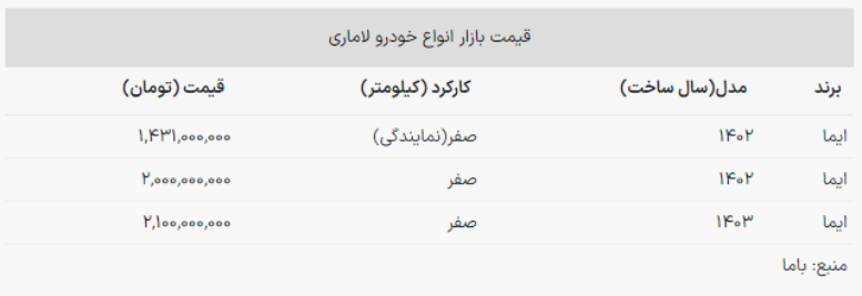 قیمت مدل ۱۴۰۲ لاماری ایما نیز در بازار بدون تغییر ۲ میلیارد تومان ماند.