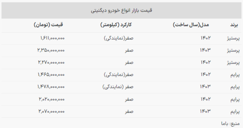 با مطالعه جدول زیر اطلاعات بیشتری درباره قیمت روز خودروهای دیگنیتی به دست خواهید آورد:
