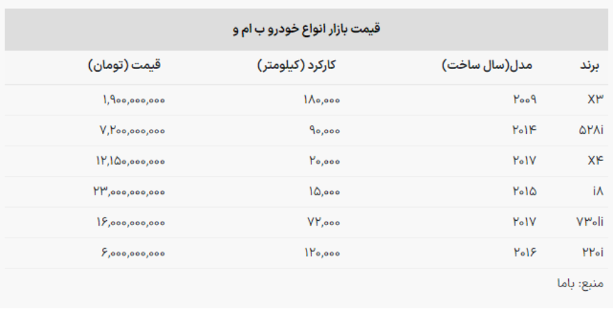 با مطالعه جدول زیر اطلاعات کاملی درباره قیمت روز خودروهای BMW به دست خواهید آورد: