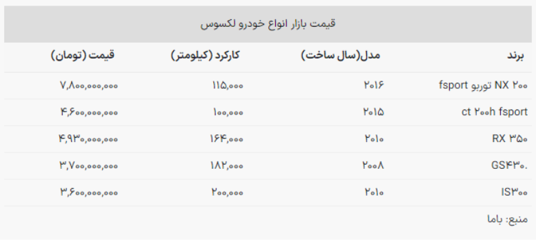 با مطالعه جدول زیر اطلاعات کاملی درباره قیمت روز خودروهای لکسوس به دست خواهید آورد: