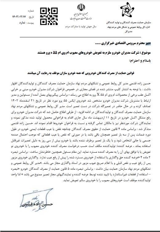 سازمان حمایت مصرفکنندگان و تولیدکنندگان اعلام کرد: با عنایت به کلیپ منتشرشده در خصوص فراخوان شرکت مدیرانخودرو مبنی بر رفع عیب برخی محصولات X55pro ذکر برخی قوانین حمایت از حقوق مصرفکنندگان جهت اطلاع همه مصرفکنندگان صنعت خودرویی کشور لازم و ضروریاست؛