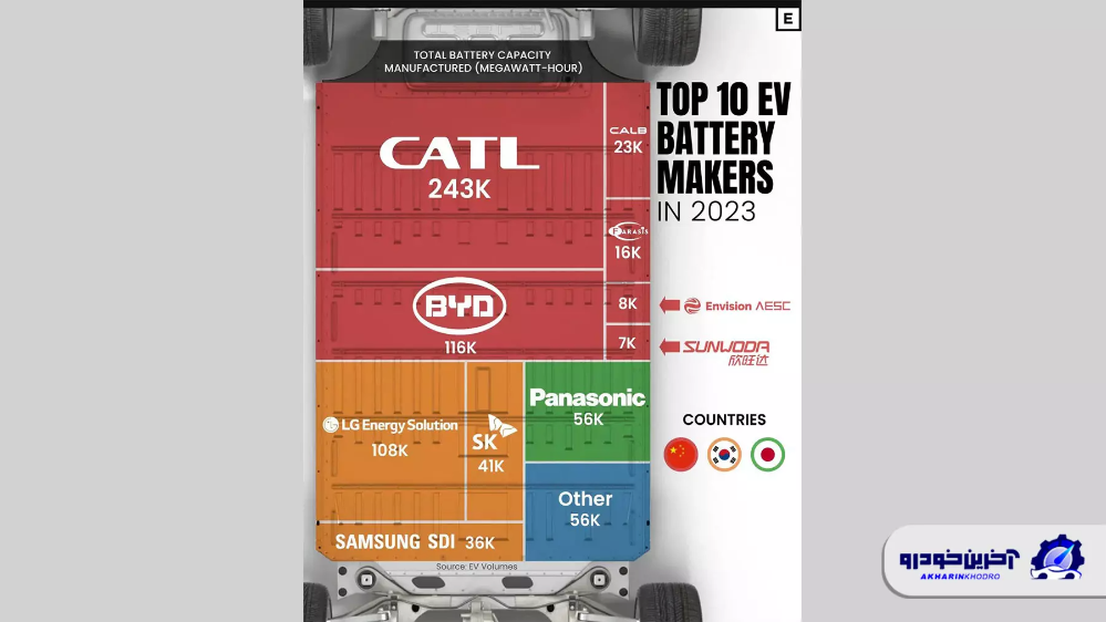 ده تولیدکننده برتر باتری خودروهای برقی بر اساس کل میزان باتری استفاده شده (به واحد مگاوات-ساعت) در سال ۲۰۲۳ معرفی شده اند. (اطلاعات از منابع EV Volumes استخراج شده است.)