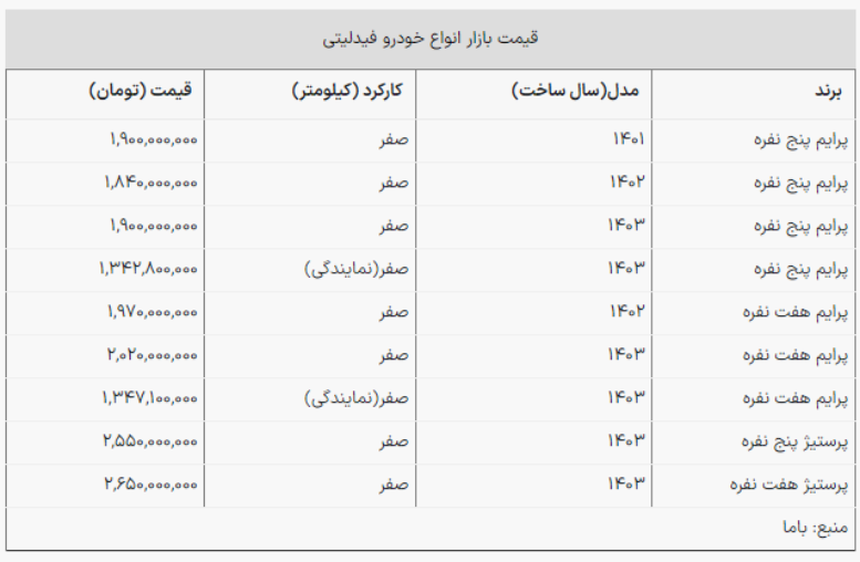 همچنین قیمت فیدلیتی پنج نفره مدل ۱۴۰۳ در بازار با کاهش ۲۵ میلیونی ۱ میلیارد و ۹۰۰ میلیون تومان شد.