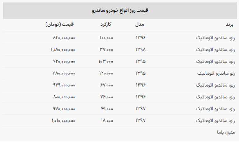 با مطالعه جدول زیر اطلاعات کاملی درباره قیمت روز خودروهای ساندرو به دست خواهید آورد: