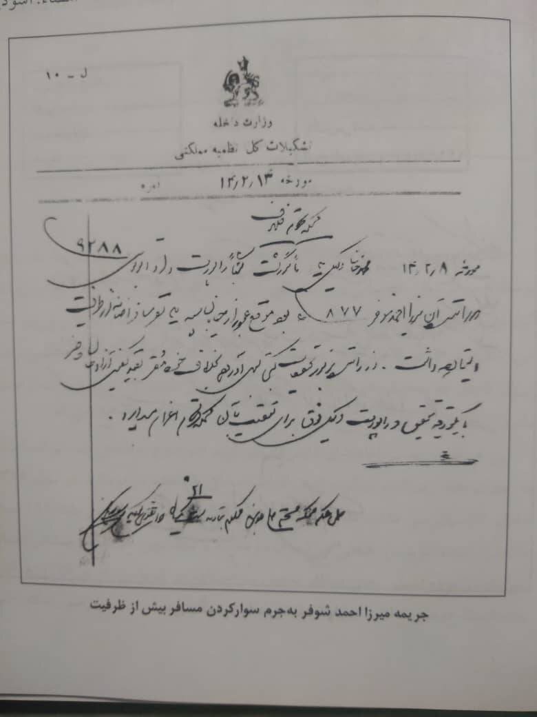 «عباس حسینی» نویسنده و محقق که ۱۸ سال درباره تاریخچه حملونقل تهران پژوهش کرده است میگوید: «آن روزگار به رانندهها «اتومبیل چی» میگفتند. گواهینامه رانندگی یک دفترچه بود که هر برگش برای یک موضوع در نظر گرفته میشد. در صفحه ۴ این دفترچه تخلفات اتومبیلچیها نوشته میشد. برخی از رانندهها آنقدر تخلف میکردند که این صفحه دیگر جایی برای نوشتن تخلف جدید نداشت. برای همین برخی از آنها از قصد گواهینامه خود را گم میکردند تا بتوانند گواهینامه جدید با صفحه سفید تخلفات بگیرند. البته نظمیه هم پروندهای تشکیل میداد تا تخلفات اتومبیلچی را جمعآوری کند. برخی از رانندههای متخلف آن روزگار آنقدر معروف میشدند که مجبور بودند با گریم چهره به رانندگی خود ادامه دهند.»