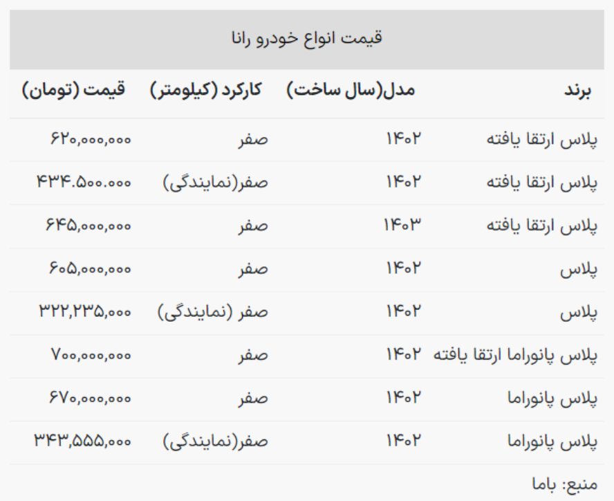 با مطالعه جدول زیر اطلاعات بیشتری درباره قیمت روز خودروهای رانا به دست خواهید آورد: