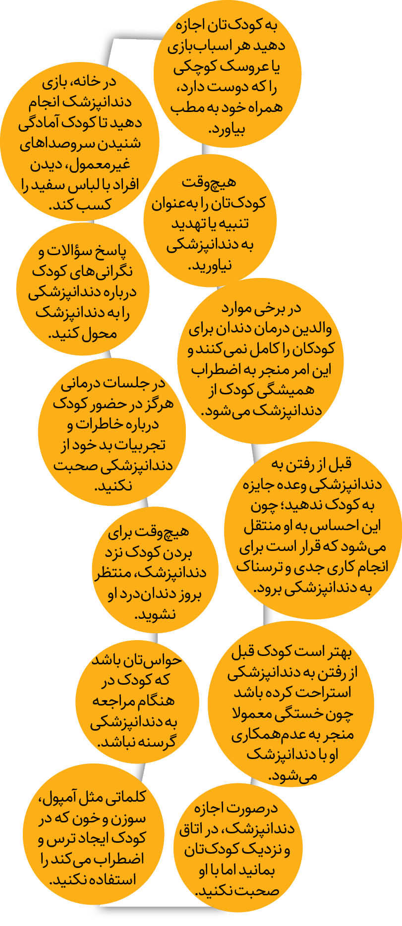 متخصصان میگویند اگر کودک دندانپزشکهراسی دارد با او رفتار تند و تحقیرآمیز نداشته باشید یا او را به اجبار و گریه نزد دندانپزشک نبرید. به او دروغ نگویید و از دادن پاسخهای سرسری که منجر به تشدید اضطراب میشود هم پرهیز کنید. این مسئله را دکتر مصطفی محاوری، متخصص دندانپزشکی کودکان و نوجوانان تأیید و در اینباره چند توصیه مطرح میکند. او در ابتدا به همشهری میگوید: «مثل بسیاری از بزرگسالان، کودکان هم میتوانند دچار ترس از دندانپزشکی شوند. اما یکی از دلایل اضطراب کودکان از دندانپزشکی، بیتجربه بودن آنهاست و به همین دلیل مراجعه منظم برای چکاپ باعث میشود که کودک با محیط مطب، کارکنان و دندانپزشک آشنا شود و بهاصطلاح به آن عادت کند.» محاوری با بیان اینکه تزریق بیحسی به دندان هم شایعترین عامل ترس کودک است، عنوان میکند: «بعضی تکنیکها کمک میکند تا کودک اصلا متوجه نشود که به او بیحسی تزریق کردیم؛ تکنیکهای سادهای مثل پرت کردن حواسش، پنهان کردن آمپول از دید کودک، مالش دادن ناحیه تزریق، صحبت کردن با او و...»