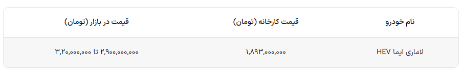 لاماری ایما HEV جدیدترین محصول شرکت آرین پارس موتور است که به تازگی به مشتریان خودرو های وارداتی تحویل شده و حالا می توان آگهی های مربوط به این خودرو را در پلتفرم های خرید و فروش خودرو دید. بر اساس آگهی های منتشر شده، قیمت لاماری ایما هیبرید در بازار آزاد از ۲ میلیارد و ۹۰۰ میلیون تومان تا ۳ میلیارد و ۲۰۰ میلیون تومان در نظر گرفته شده است. البته انتظار می رود با ادامه روند تحویل ها قیمت این خودرو در بازار تعدیل شود.