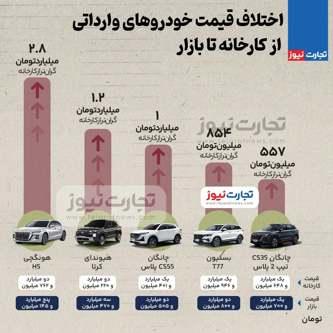 بر اساس جدول فوق، هونگچی H5 با اختلاف بیش از دو میلیارد و 800 میلیون تومان، رکورددار اختلاف قیمت از کارخانه تا بازار بوده و پس از آن، هیوندای کرتا با یک میلیارد و 200 تومان اختلاف در مقام دوم قرار میگیرد. شایان ذکر است زوتی DL5 با اختلاف 120 میلیون تومانی از کارخانه تا بازار، کمترین اختلاف قیمت را در میان محصولات وارداتی بازار دارد.