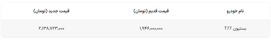 / با ارسال فراخوان پرداخت دعوتنامه های خرید و مشخص شدن قیمت جدید، قیمت تمام شده بستیون T77 به بالای ۲ میلیارد رسیده است.