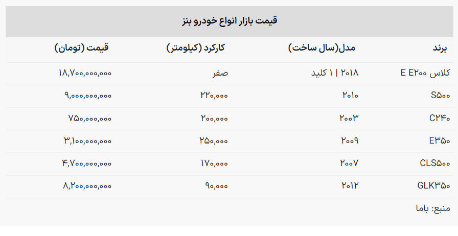 با مطالعه جدول زیر اطلاعات کاملی درباره قیمت روز انواع خودروهای بنز در بازار به دست خواهید آورد: