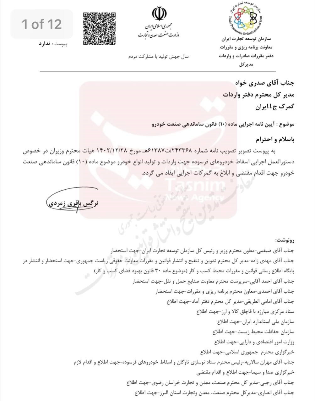 به پیوست تصویر تصویب نامه شماره ٢٤٣٣٦٨/ت٦١٣٨٧هـ مورخ ٢٨/١٢/1402 هیات محترم وزیران در خصوص دستورالعمل اجرایی اسقاط خودروهای فرسوده جهت واردات و تولید انواع خودرو موضوع ماده (10) قانون ساماندهی صنعت خودرو جهت اقدام مقتضی و ابلاغ به گمرکات اجرایی ایفاد می گردد.