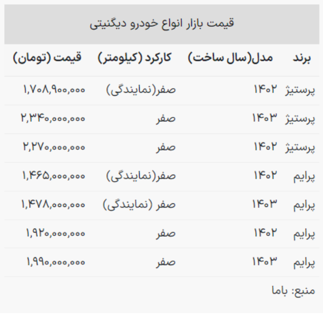 قیمت دیگنیتی صفر مدل پرستیژ ۱۴۰۳ به ۲ میلیارد و ۳۴۰ میلیون تومان رسید که رشد ۶۰ میلیونی داشته است.
