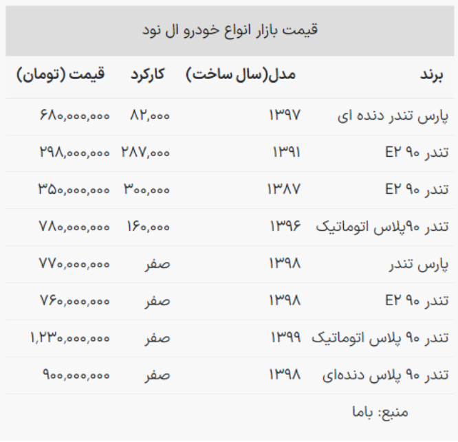 با مطالعه جدول زیر اطلاعات بیشتری درباره قیمت روز خودروهای ال نود به دست خواهید آورد:
