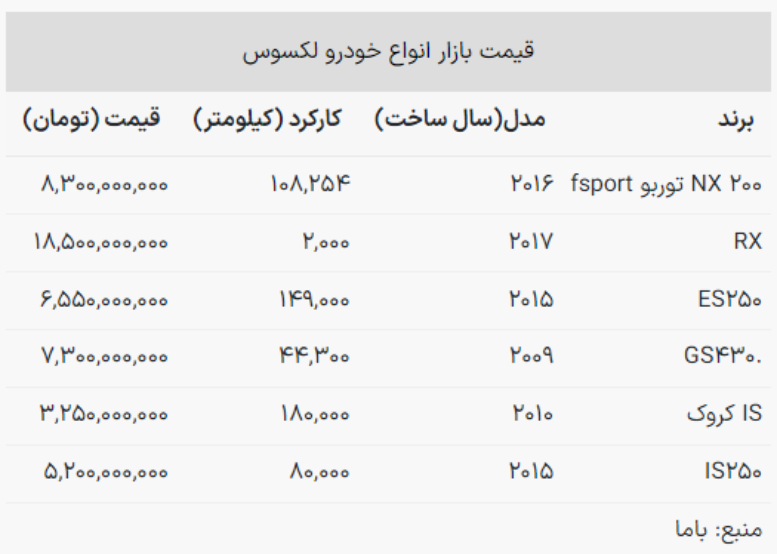 با مطالعه جدول زیر اطلاعات کاملی درباره قیمت روز خودروهای لکسوس به دست خواهید آورد: