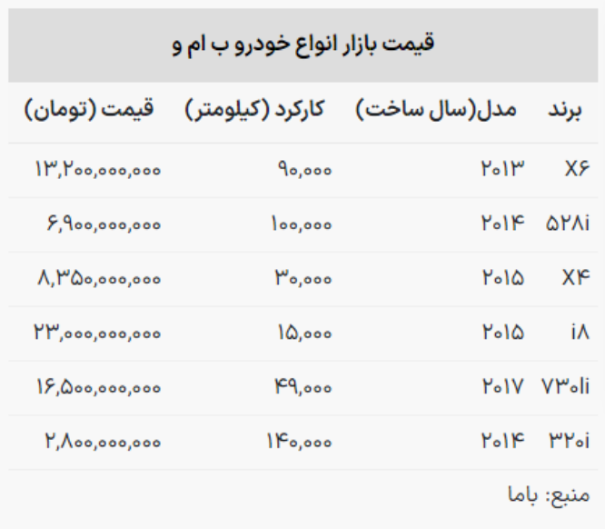 اقتصاد آنلاین/ در ادامه به بررسی قیمت مدل های مختلف ب ام و در بازار می پردازیم.