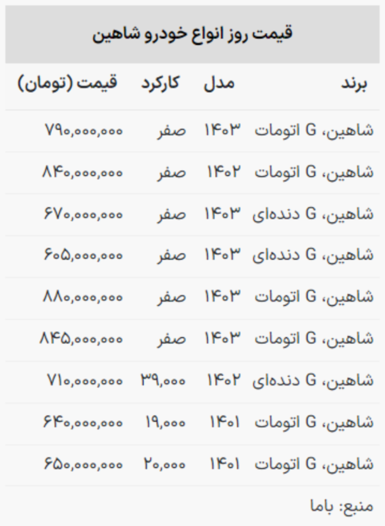 با مطالعه جدول زیر اطلاعات کاملی درباره قیمت روز خودروهای شاهین به دست خواهید آورد: