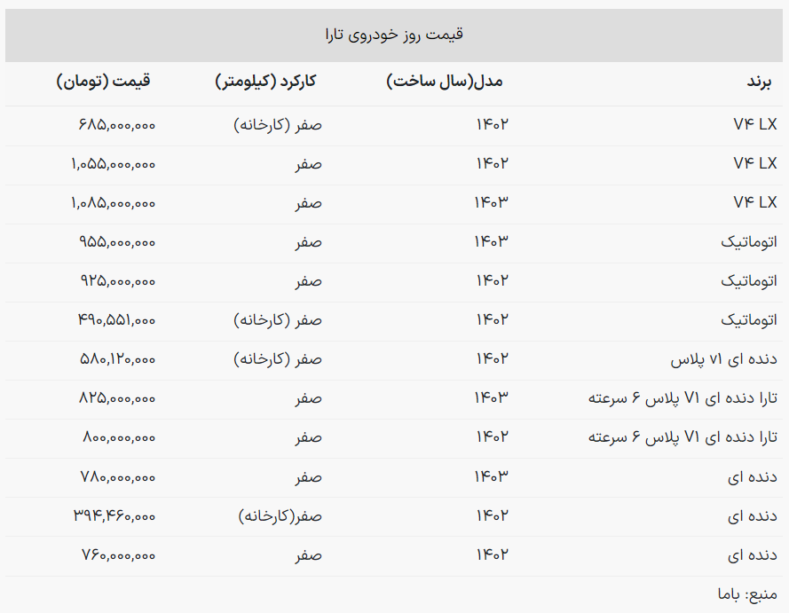 قیمت تارا اتوماتیک V۴ LX مدل ۱۴۰۳ ۱ میلیارد و ۸۵ میلیون تومان شد.