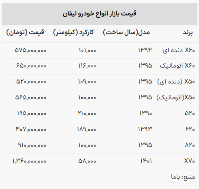 با مطالعه جدول زیر اطلاعات بیشتری درباره قیمت روز خودروهای لیفان به دست خواهید آورد: