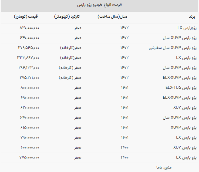 با مطالعه جدول زیر اطلاعات بیشتری درباره قیمت روز خودروهای پژو پارس به دست خواهید آورد: