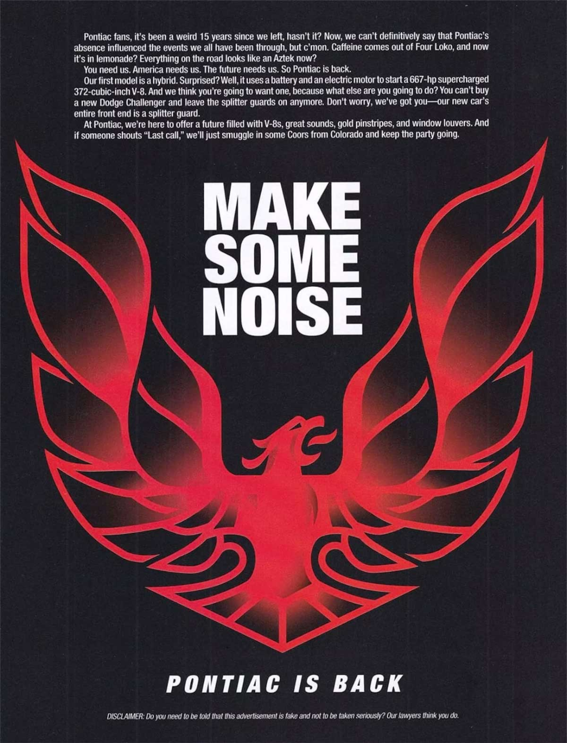 طرفداران پونتیاک، ۱۵ سال از زمانی که ما کنار رفتیم میگذرد. شما به ما نیاز دارید، آمریکا به ما نیاز دارد، آینده به ما نیاز دارد؛ بنابراین، پونتیاک بازگشته است. اولین مدل ما هیبریدی است. غافلگیر شدید؟ خب ما از یک باطری و یک موتور الکتریکی برای روشن کردن یک پیشرانهٔ ۶.۱ لیتری V8 سوپرشارژ ۶۶۷ اسب بخاری استفاده خواهیم کرد و ما فکر میکنیم شما یکی از آن را خواهید خواست زیرا دیگر نمیتوانید دوج چلنجر بخرید. در پونتیاک ما اینجا هستیم تا آیندهای پر از V8، صداهای عالی و نوارهای طلایی را ارائه کنیم.