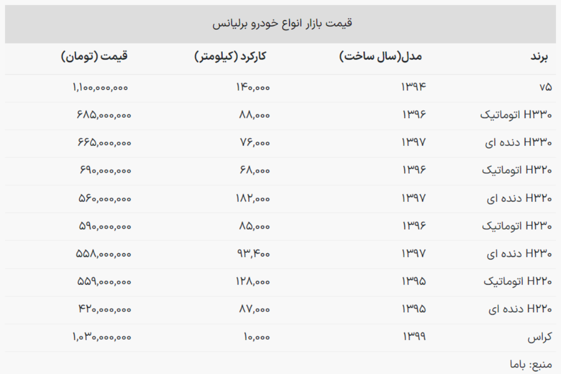 اقتصاد آنلاین/ در این گزارش به قیمت خودروهای برلیانس در بازار آزاد می پردازیم.
