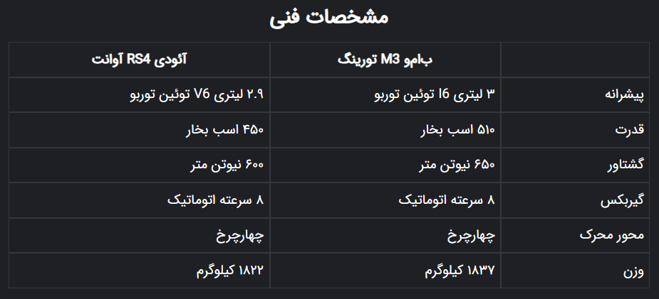 دو خودرو در مشخصات روی کاغذ اختلاف نسبتاً قابلتوجهی باهم دارند. RS4 از یک پیشرانهٔ ۲.۹ لیتری V6 توئین توربو استفاده میکند که ۴۵۰ اسب بخار قدرت و ۶۰۰ اسب بخار قدرت دارد. از سوی دیگر، زیر کاپوت بامو هم یک پیشرانهٔ ۳ لیتری شش سیلندر خطی توئین توربو قرار گرفته است که خروجی بالاتری برابر با ۵۱۰ اسب بخار قدرت و ۶۵۰ نیوتن متر گشتاور دارد. در هردو خودرو نیروی موتور توسط یک گیربکس هشت سرعتهٔ اتوماتیک به هر چهارچرخ منتقل میشود و از لحاظ وزن نیز با حدود ۱۸۳۰ کیلوگرم، بسیار نزدیک به هم هستند.