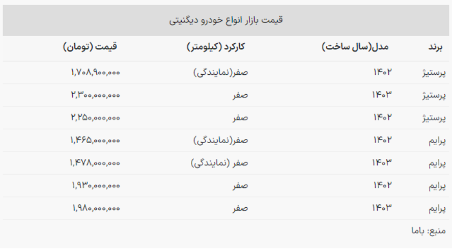 با مطالعه جدول زیر اطلاعات بیشتری درباره قیمت روز خودروهای دیگنیتی به دست خواهید آورد: