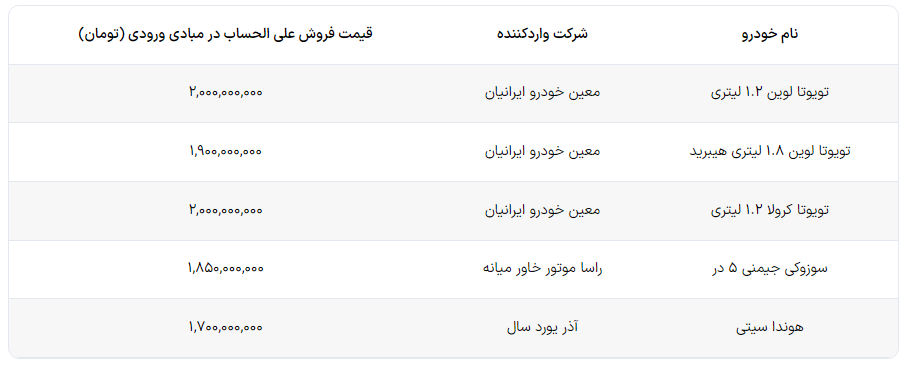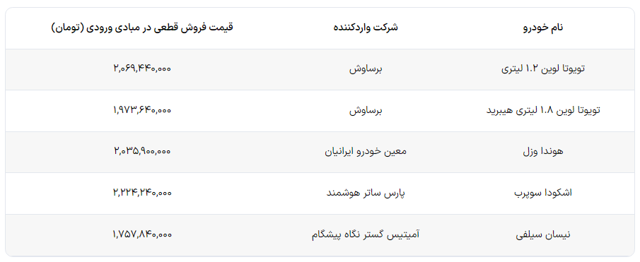 قیمت قطعی در مبادی ورودی بوده و هزینهها و عوارض قانونی پس از ترخیص از قبیل: بیمه شخص ثالث، مالیات بر ارزش افزوده، هزینههای شماره گذاری، اسقاط خودروی فرسوده، کرایه حمل و … به قیمتهای فوق اضافه میگردد که واردکنندگان با رعایت آیین نامه اجرایی قانون حمایت از مصرف کنندگان خودرو می توانند نسبت به دریافت آن اقدام نموده و در موعد مقرر نسبت به تحویل خودرو اقدام نمایند.
